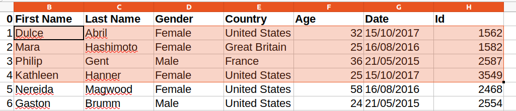 (0, 'First Name', 'Last Name', 'Gender', 'Country', 'Age', 'Date', 'Id')- Pada contoh di atas, kita ingin melihat value apa sajakah yang ada pada file excel kita, yaitu value yang berada pada row 1 kolom 1, dan mendapatkan hasil: